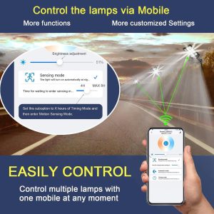 - Adjust brightness (1–100% in 1% increments). set timers (1–12 hours). and switch modes (Automatic. Timing. Motion Sensing) via iOS/Android—control multiple lights remotely for customized management.