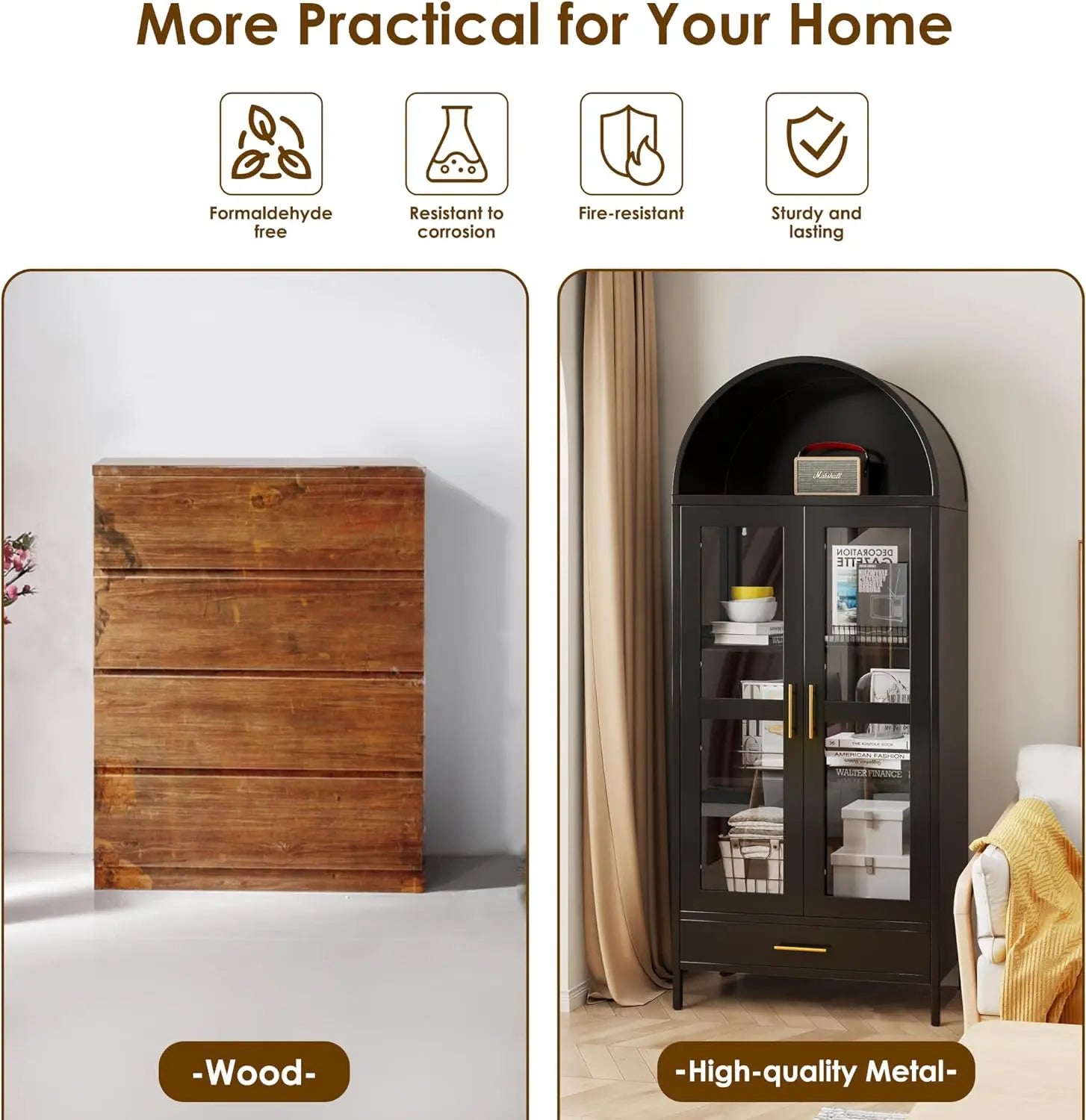 This arched storage cabinet’s spacious interior offers adjustable shelves for versatile storage and display options. while the sleek black finish adds a touch of modern elegance. Elevate your living space with our arched display cabinet. perfect for highlighting your collectibles and enhancing your home’s aesthetic.