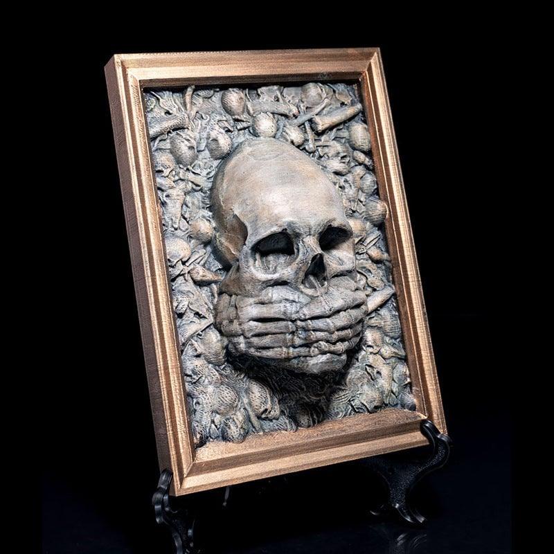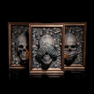These intricately designed skull frames capture the essence of the see no evil. hear no evil. speak no evil proverb with a chillingly artistic flair.