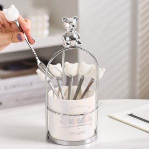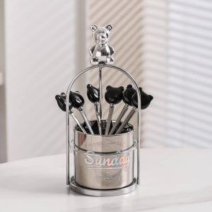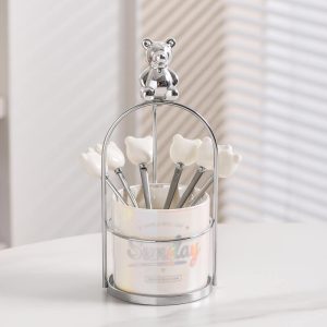 - Enhancing the Space: The Bear Ceramic Dessert Fork & Spoon Storage Jar can significantly enhance the ambiance of your kitchen or dining area. Its cute design and ceramic material create a sense of style and functionality. It can be placed in different areas. such as on a kitchen counter or a dining table. adding a touch of charm to your space. The jar’s ability to store dessert forks and double as a decorative piece makes it a practical and decorative addition to your home decor.