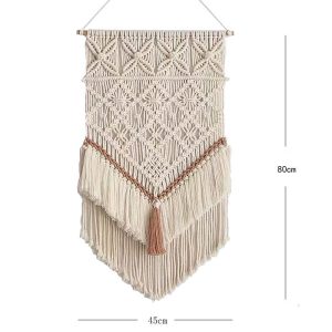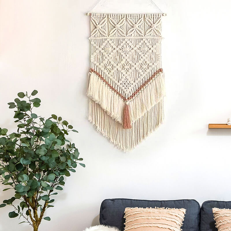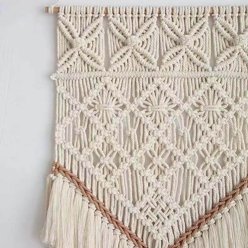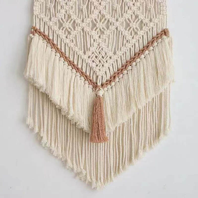 - Textural Dimension: In addition to their visual appeal. the tassels contribute to the tactile experience of the wall hanging. The soft. flowing strands of the tassels provide a different texture compared to the woven cotton base. making it more engaging to touch and interact with. This textural variation enhances the overall sensory experience of the piece.