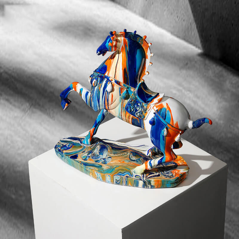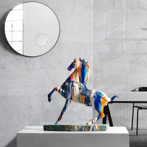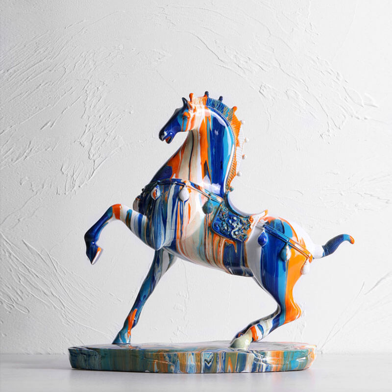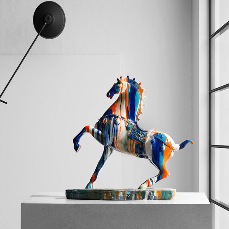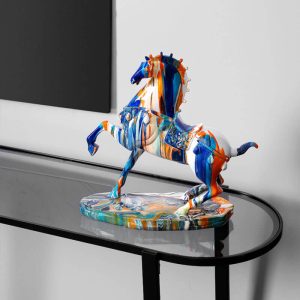 Revitalize your living space with this bold resin horse sculpture. blending edgy camouflage patterns with vibrant pop art hues. Designed to juxtapose military motifs and playful colors. it creates a striking focal point for modern. eclectic. or luxury interiors.