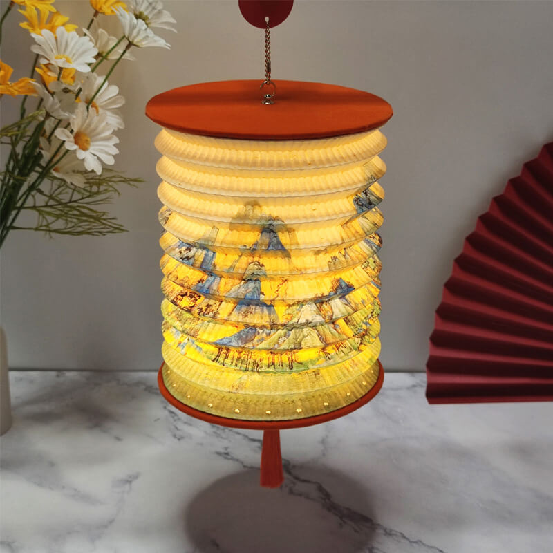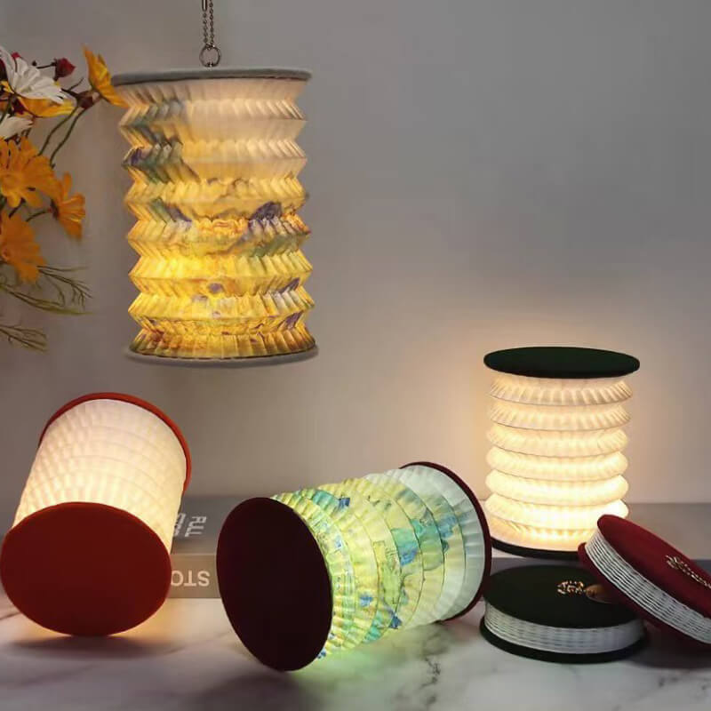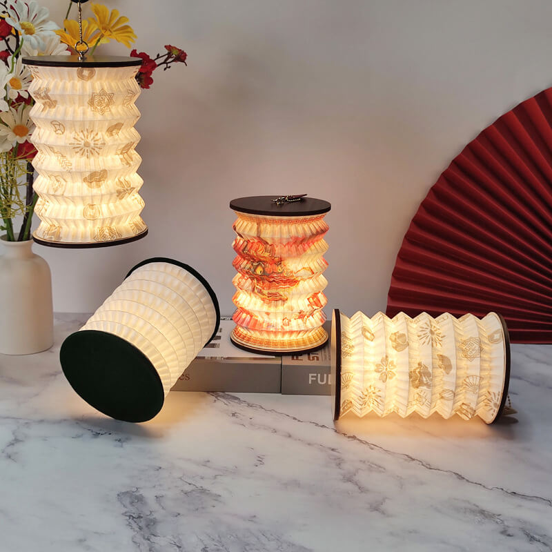 - DuPont Paper Lampshade: The lampshade is crafted from durable. lightweight DuPont paper—a material known for its tear resistance and soft translucency. When folded. it resembles a compact book (12012032mm). perfect for slipping into a bag or storing on a shelf. When opened. it expands into a vibrant lantern with intricate geometric or floral patterns etched into the paper.