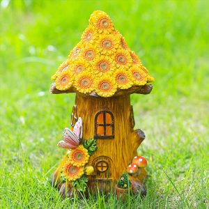 - Resin Craftsmanship: The treehouse features a rustic wooden-style exterior with shingled roofs. arched windows. and a tiny porch. all crafted from durable. weather-resistant resin. The sunflowers surrounding the house have vibrant yellow petals and textured centers. mimicking real blooms.