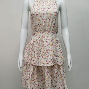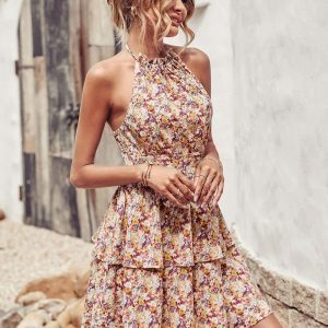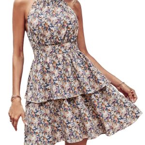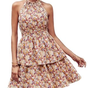 1 x Lighteme Summer Floral Halter Dress with Ruffle Details and Backless Design