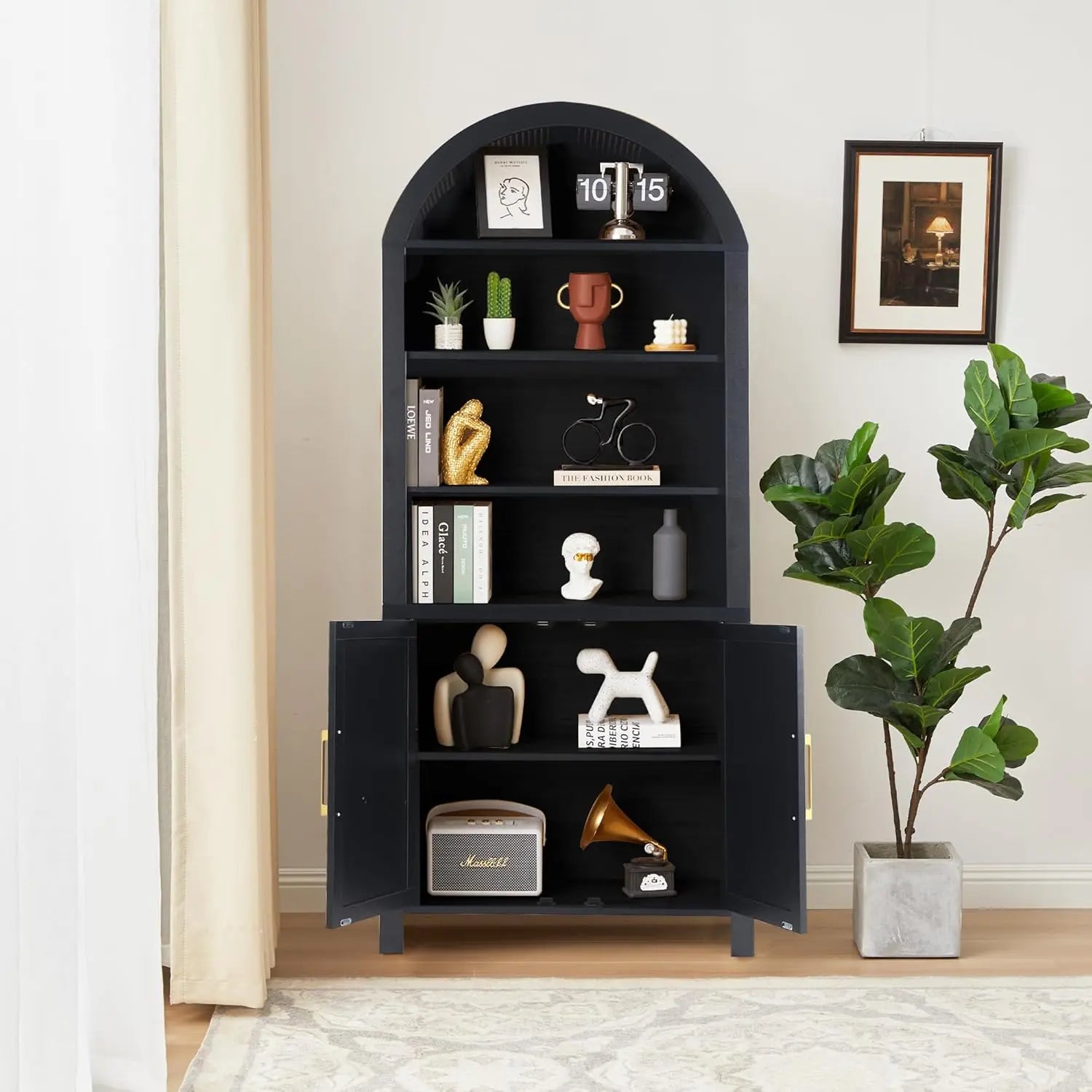 This arched display cabinet‘s spacious interior offers adjustable shelves for versatile storage and display options. while the sleek finish adds a touch of modern elegance. Elevate your living space with our tall arched cabinet. perfect for highlighting your collectibles and enhancing your home’s aesthetic.