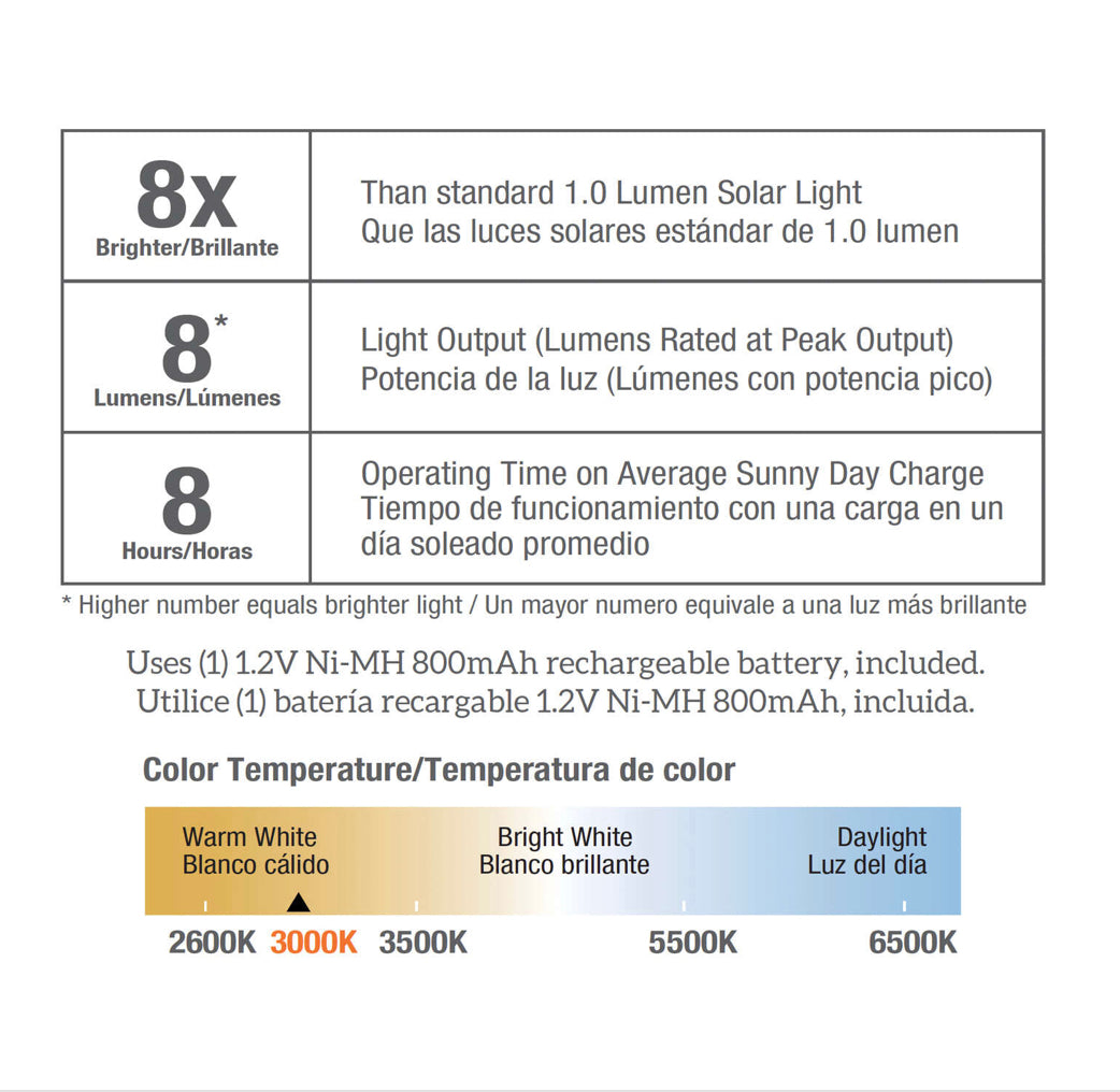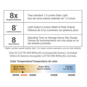 - 8-Hour Runtime: Provides up to 8 hours of continuous nighttime light after a full solar charge (weather-dependent). ensuring consistent performance for evening gatherings or daily use.
