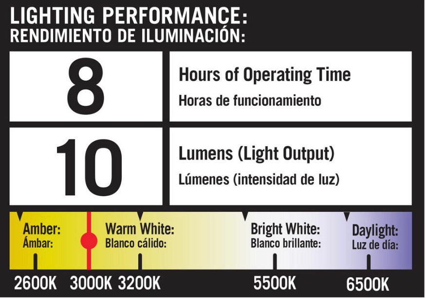 - Light Output: 8 lumens per light (warm white LED)