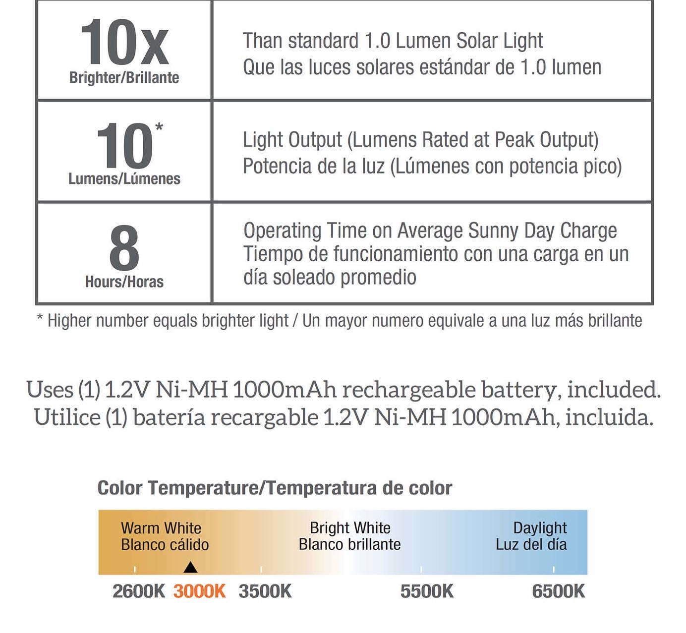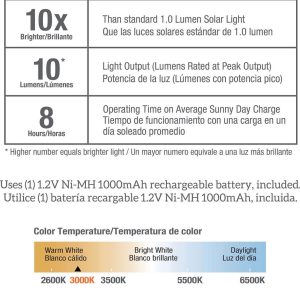- Wireless & Eco-Friendly: 100% solar-powered. eliminating electricity costs and the need for wiring. Each light features a built-in 12V 600mAh Ni-MH rechargeable battery. charged by sunlight during the day to provide 6+ hours of gentle 10-lumen illumination at night.