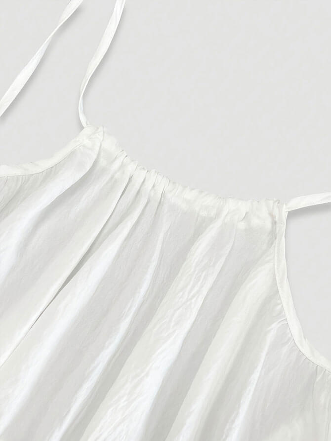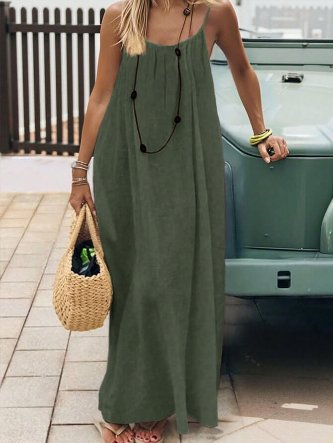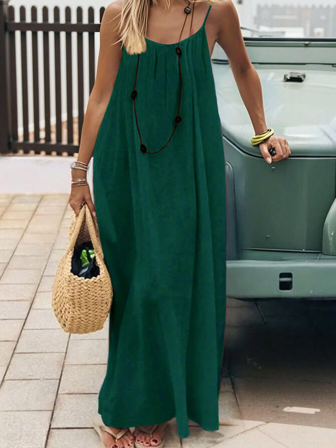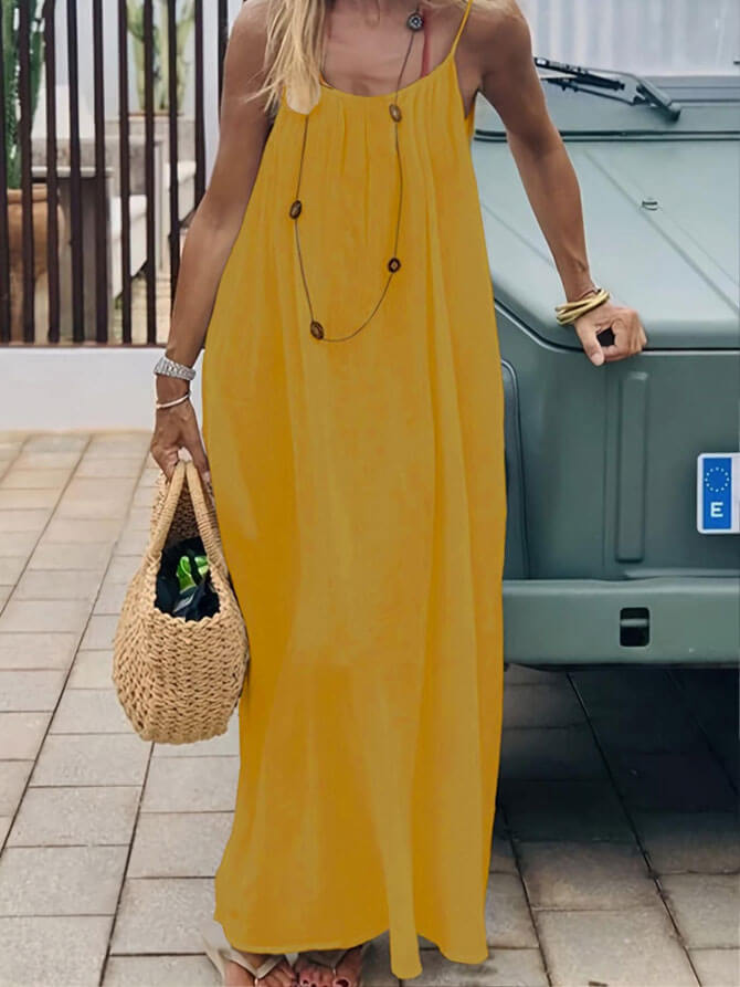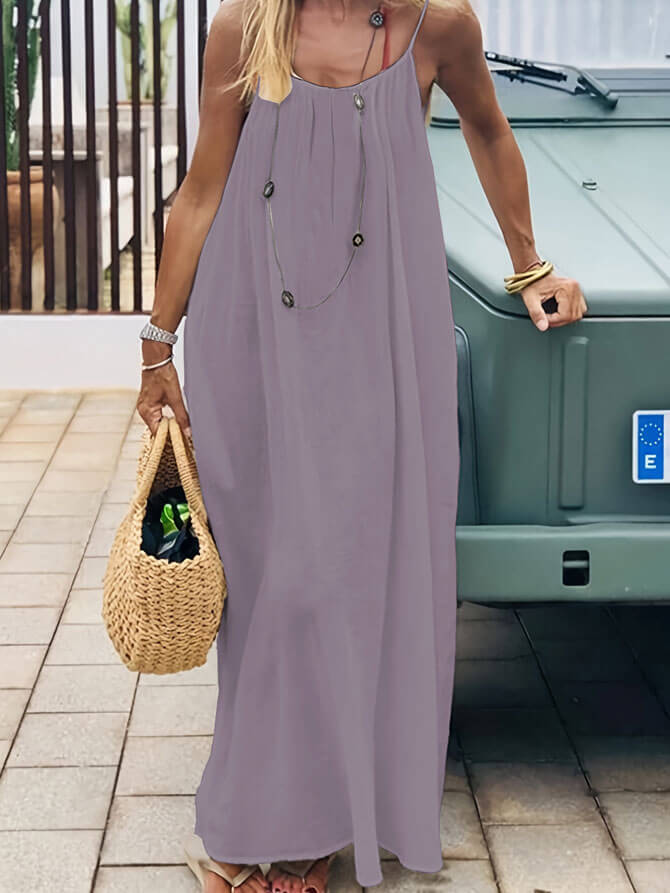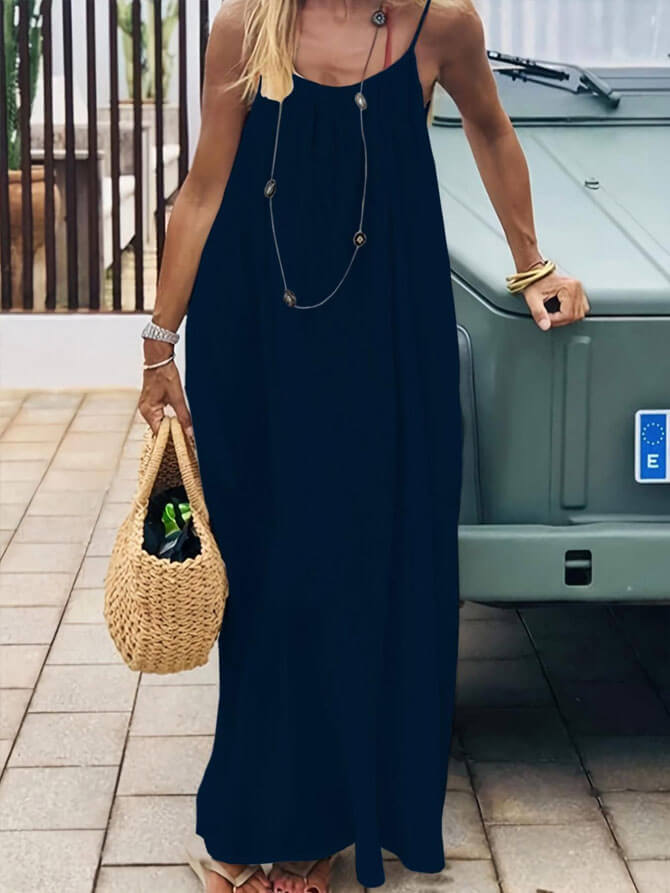 This flowing maxi dress is designed as an effortless house dress, combining comfort with understated elegance for everyday wear at home. The relaxed, draped silhouette falls naturally on the body, offering ease of movement and a flattering fit without feeling restrictive. A softly open back and delicate spaghetti straps add a feminine, modern touch while keeping the overall look minimal and refined.