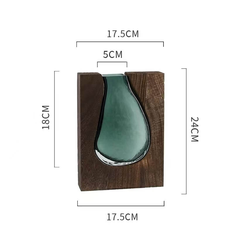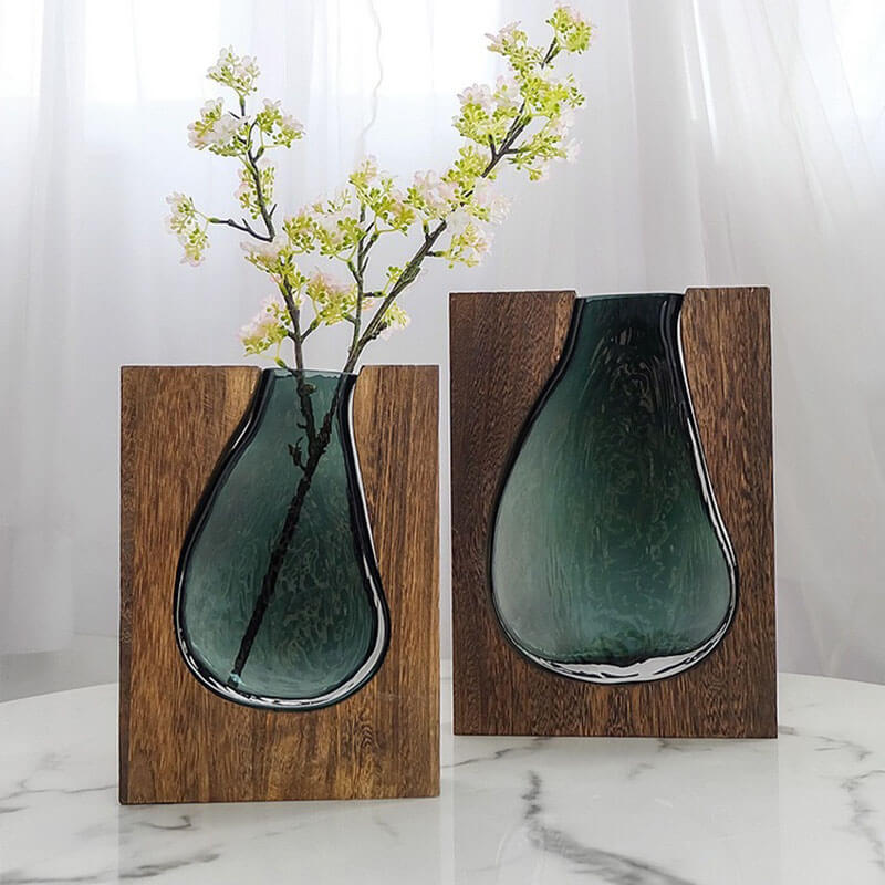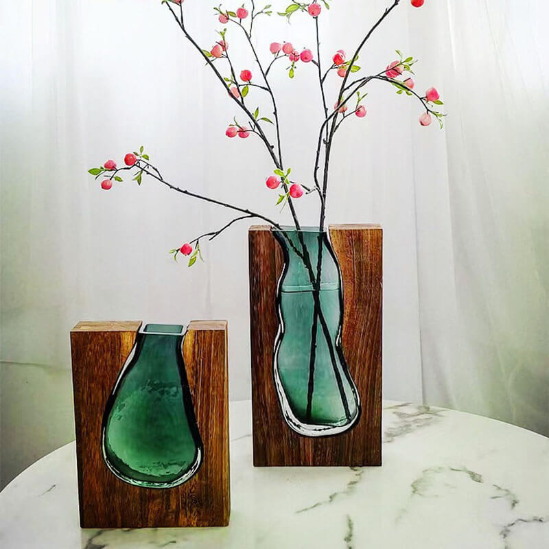 - Haltbarkeit und Qualität : Die Verwendung von hochwertigem Glas und Holz sorgt für Langlebigkeit. Glas ist ein robustes Material, das regelmäßiger Nutzung und Handhabung standhält, und das Holz sorgt für stabilen Halt. Die Kombination dieser Materialien verleiht der Vase eine glatte und polierte Oberfläche und verbessert so ihre Optik und Haptik. Das Holz verleiht ihr einen Hauch von Wärme und Struktur, während das Glas ihr ein klares und elegantes Aussehen verleiht.