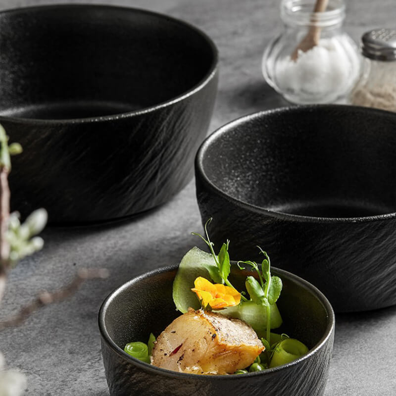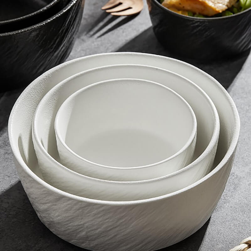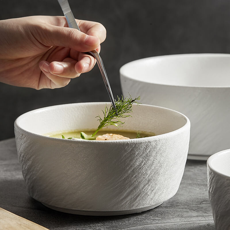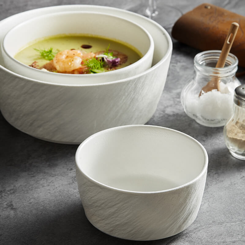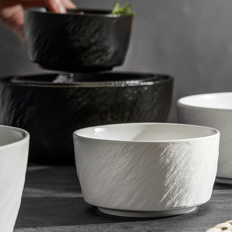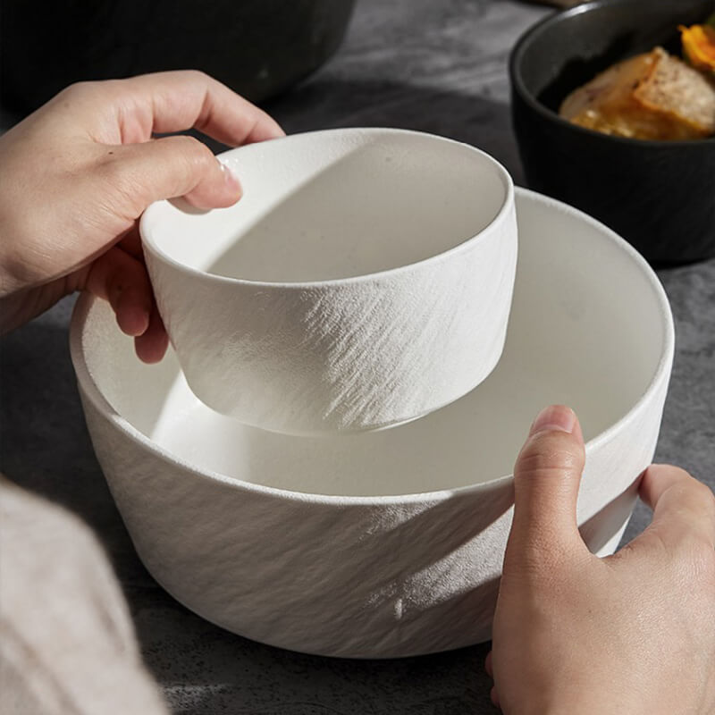 - Esthétique robuste : La surface du bol présente une texture tactile, semblable à celle de la pierre, avec un vernis mat givré, créant un aspect à la fois rustique et sophistiqué. Les motifs en relief imitent les irrégularités de la pierre naturelle, ajoutant profondeur et intérêt visuel qui s'harmonisent aussi bien avec un décor décontracté que haut de gamme.