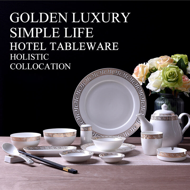 - Bordure dorée : Chaque assiette, bol, cuillère et tasse est ornée d'une fine bordure dorée, ajoutant une touche d'opulence et rehaussant l'attrait visuel de l'ensemble. La bordure dorée est appliquée selon une technique de surglaçage minutieuse, garantissant durabilité et brillance impeccable.