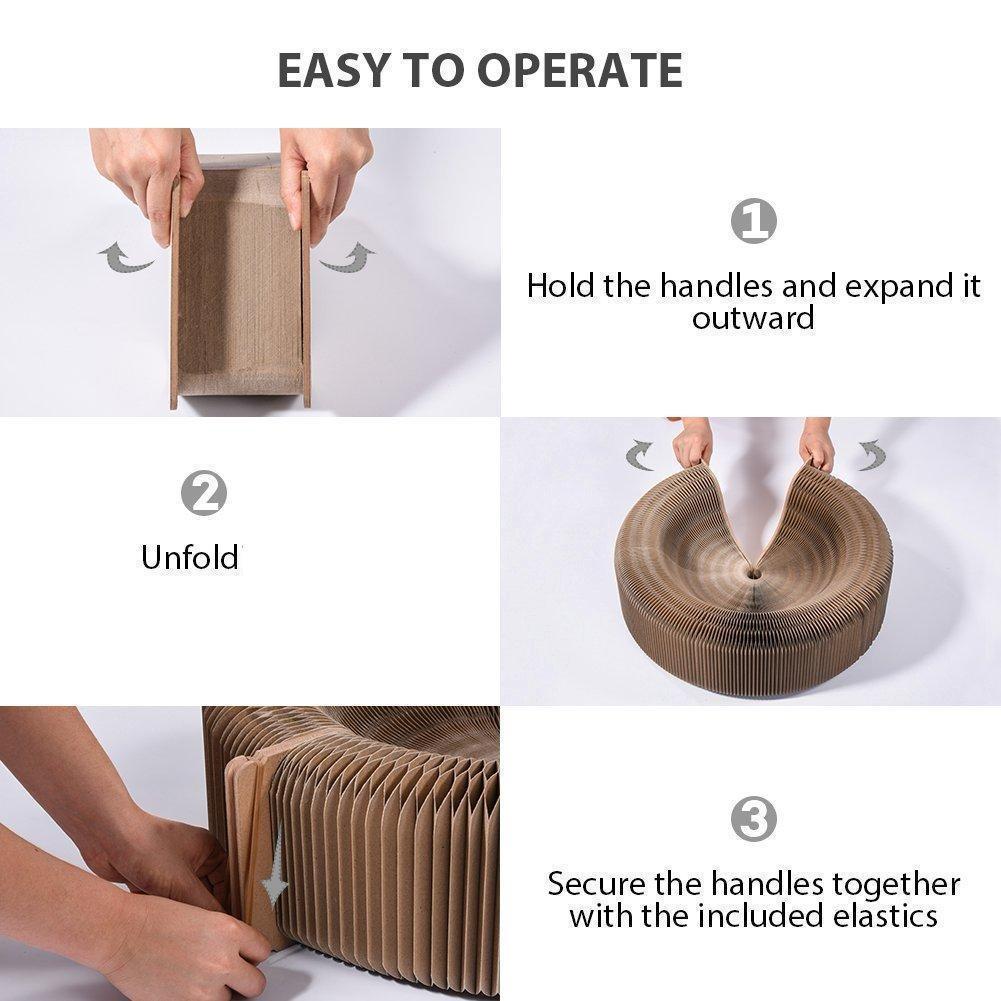Voici un jouet pliable et métamorphe ! Regardez la vidéo pour découvrir comment il se transforme instantanément d'un lit en griffoir ou se replie entièrement pour un rangement facile.