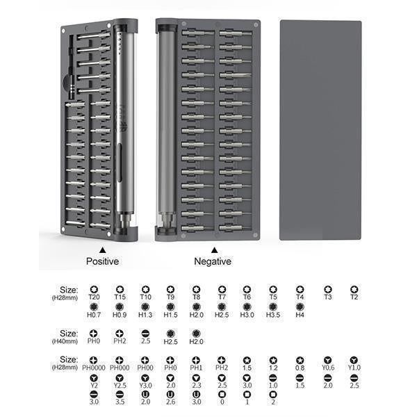 Utilisation polyvalente : livré avec 55 embouts de précision et une barre d'extension, différents embouts de tournevis de différentes spécifications peuvent facilement répondre à différents besoins. Convient aux montres à quartz, aux appareils électroménagers courants tels que les appareils photo numériques, les radios, les tablettes, les smartphones, les drones, les joysticks, etc.