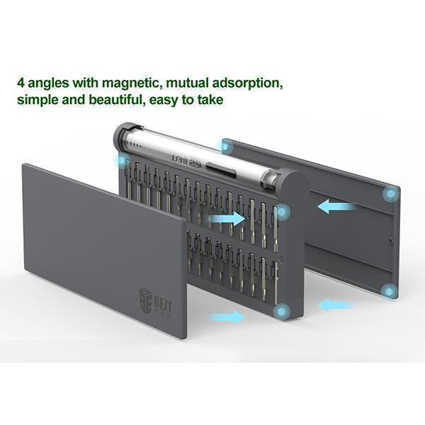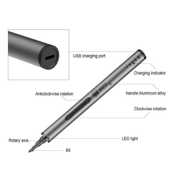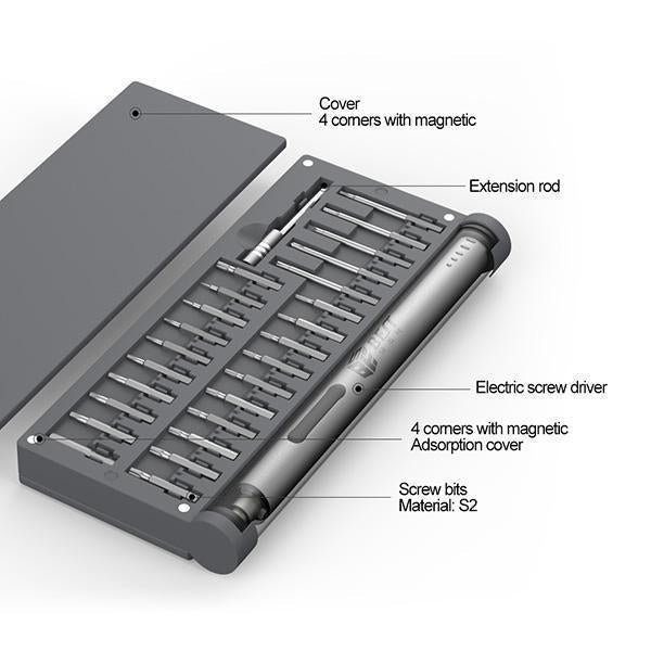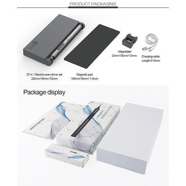 - 【Contenu de l'emballage】 1 mini tournevis électrique ; 55 embouts de précision ; 1 tige d'extension, 1 magnétiseur, 1 tampon magnétique, câble de chargement USB ; étui de rangement.