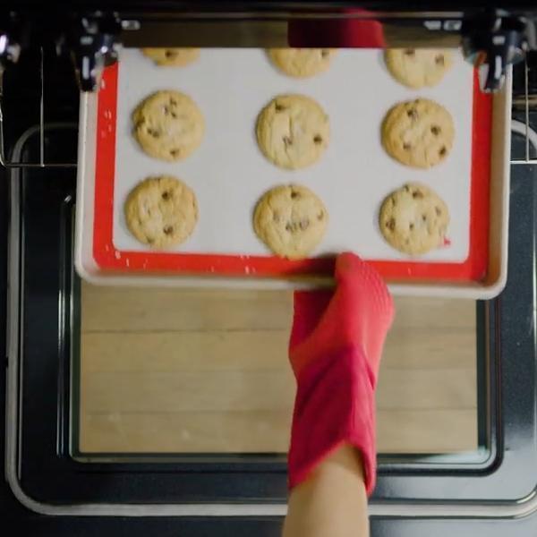 - Placez le tapis de cuisson en silicone sur la plaque à pâtisserie. Rincez-le après utilisation pour un rangement facile ou une utilisation continue.