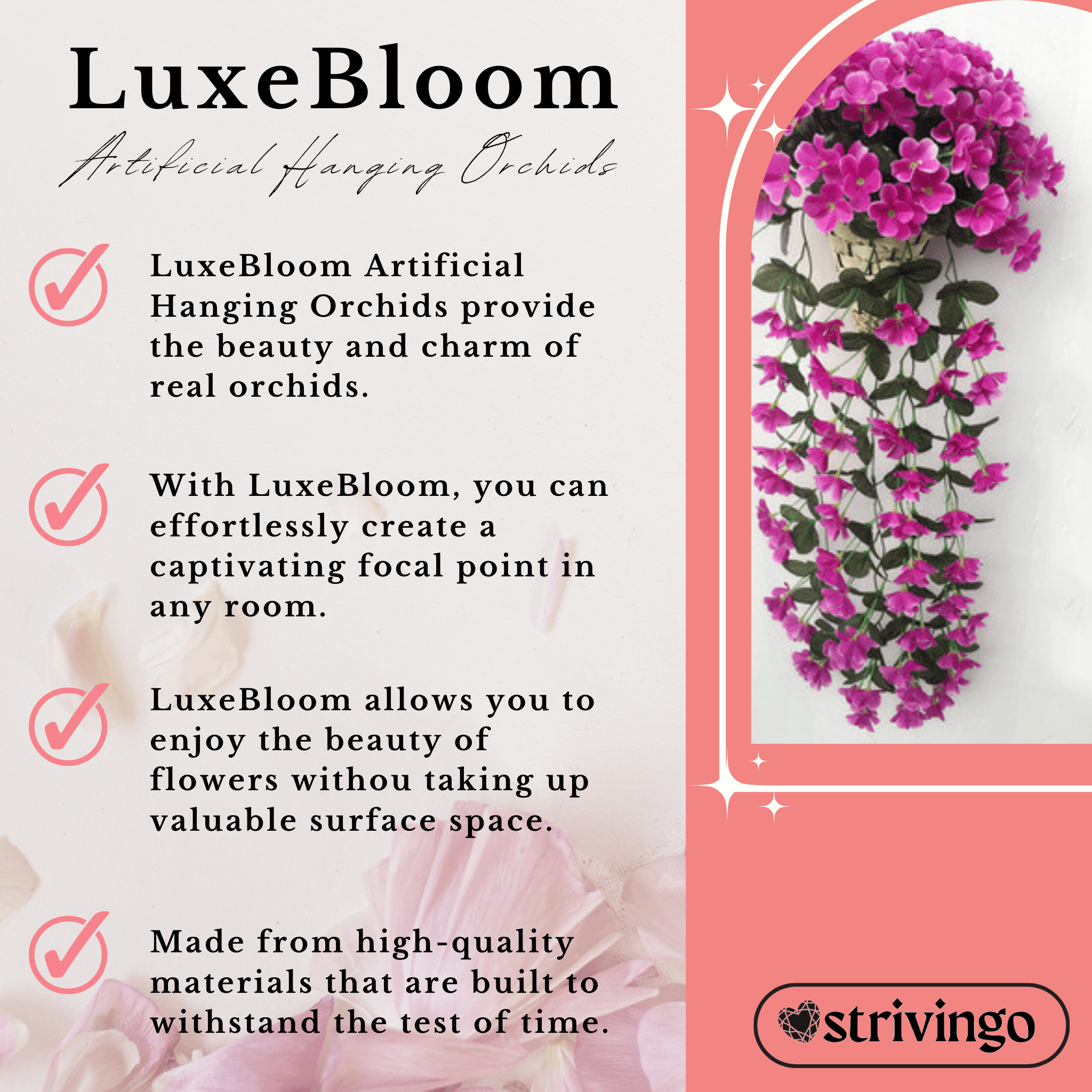 ✓ Effortless Elegance – With our hanging orchids. you can create a captivating focal point in any room effortlessly. The graceful vines and delicate blooms add a touch of sophistication to your living space.