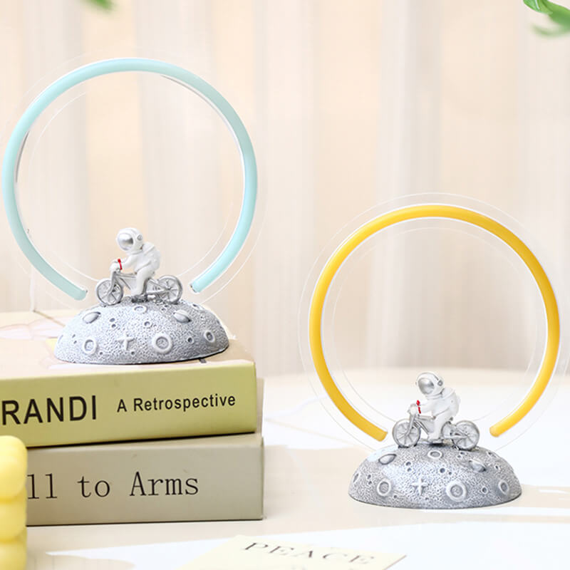- Minimalist Resin Craftsmanship: The lamp showcases a sleek astronaut figure in a classic space suit. seated on a retro-style bicycle. Crafted from smooth resin. the design features clean lines and a matte finish. available in neutral tones like white. gray. or metallic silver for a modern. futuristic look.