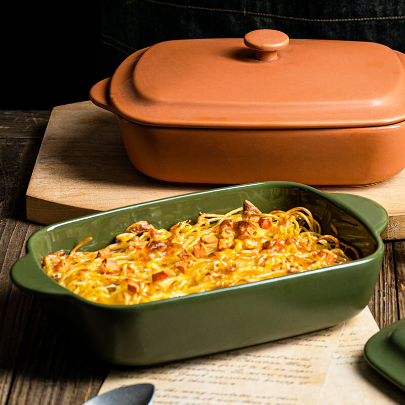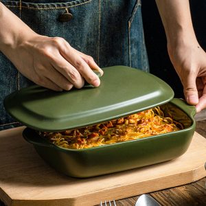 - Versatile Use: This baking dish is not only suitable for baking but also for serving a variety of dishes. Its ceramic material and lid design make it a versatile addition to your kitchen. You can use it to bake casseroles. desserts. and other dishes. and then serve them directly from the dish. The dish is also easy to clean. making it a practical choice for everyday use.