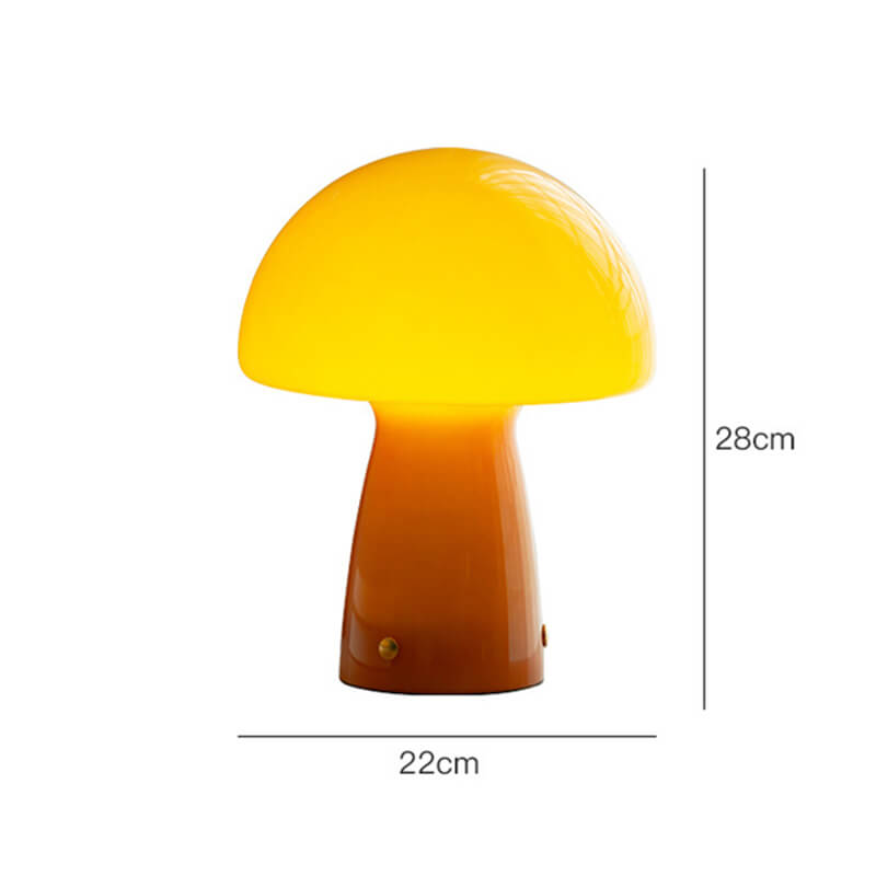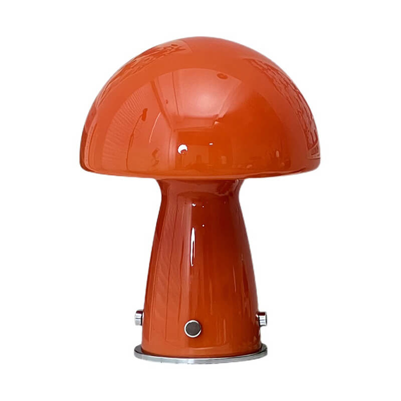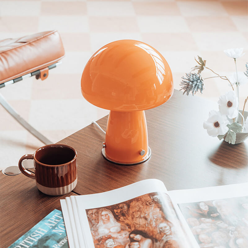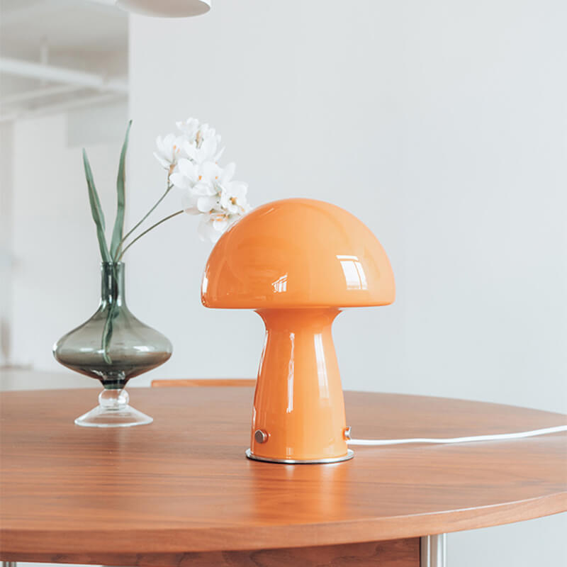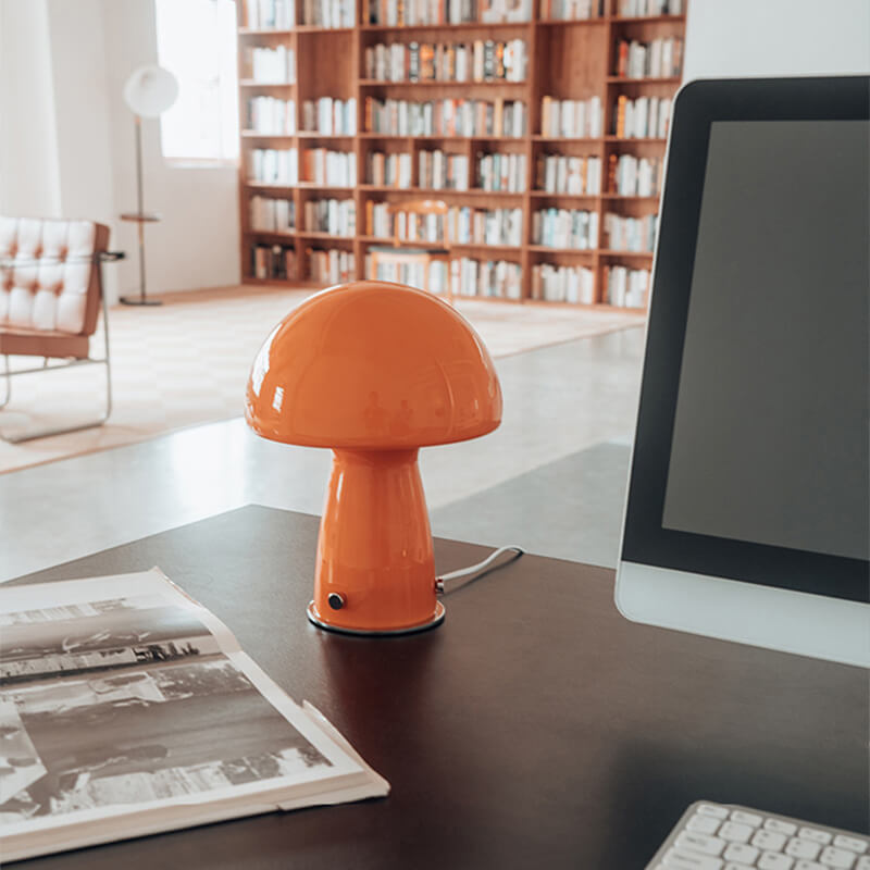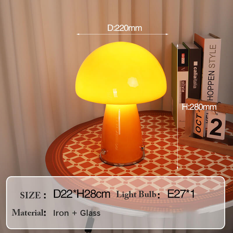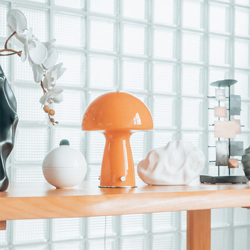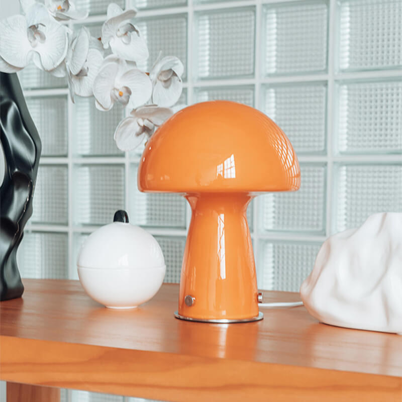 - Iron & Glass Craftsmanship: The lamp features a durable iron base shaped like a mushroom stem. finished in matte black or white for a modern Nordic touch. The lampshade is a hand-blown glass mushroom cap in either pure white or warm orange. with a smooth. translucent surface that diffuses light softly.