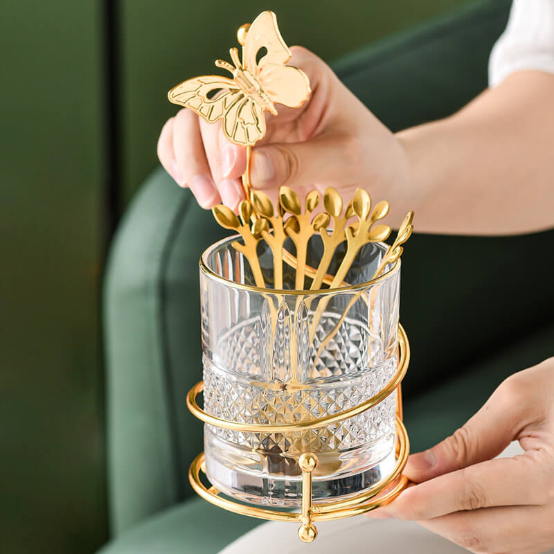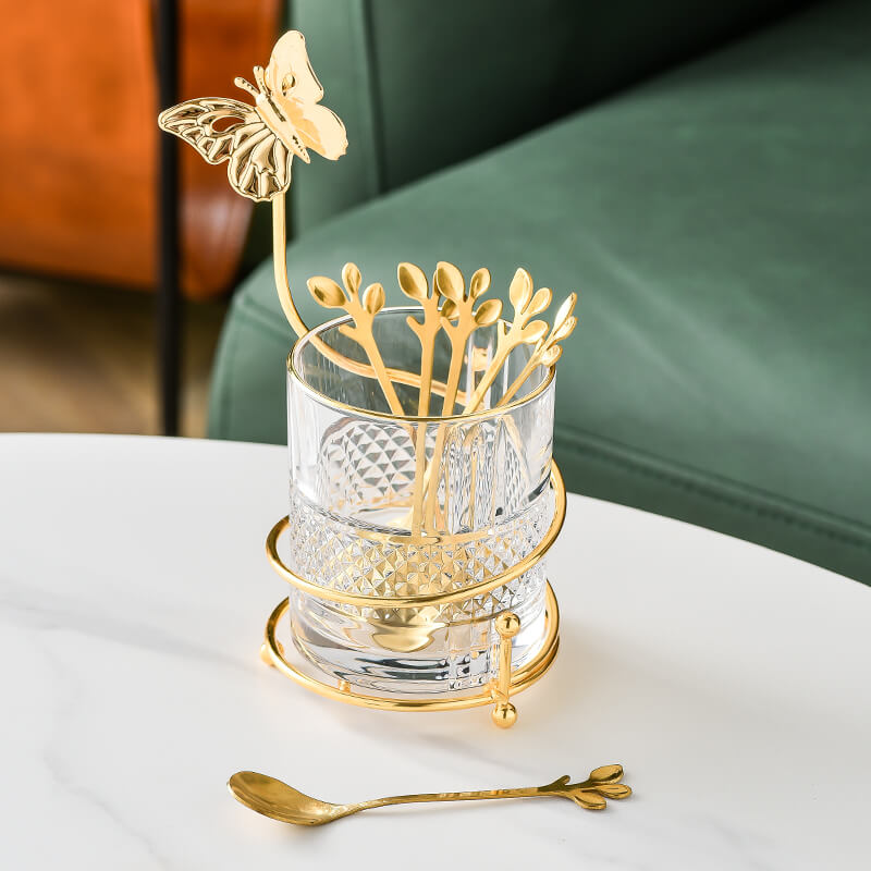 The Lighteme Curve Dessert Fork & Spoon Glass Storage Jar. with item number 202306KS05. is a remarkable addition to any kitchen or dining area. Comprising of glass and iron. this storage jar comes with 6 forks or spoons. Its gold-plated iron frame in a curved spiral shape not only adds a touch of sophistication but also makes it a visually appealing and practical storage solution.