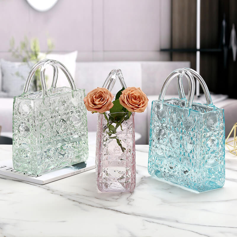 - Unique Decor Element: This vase serves as a unique decor item that stands out among traditional vases. The glass material. combined with the handbag shape. creates a visually appealing display. It allows for creative flower arrangements. with the vase acting as both a container and a decorative piece. The different colors available enhance its aesthetic. making it a great choice for those who want to add a pop of color or a sleek. transparent look to their decor.