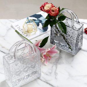 - Versatile Decor Item: The vase’s handbag design and glass material make it a versatile decor item. It can be used to create different looks. from a simple and elegant display with a single flower to a more elaborate arrangement with multiple blooms. The vase can also be used as a standalone piece. showcasing its unique shape and color. Its versatility allows it to be paired with other decor elements. such as candles. figurines. or other vases. creating a cohesive and stylish look in the room.