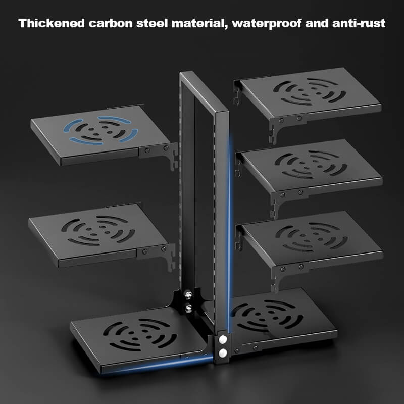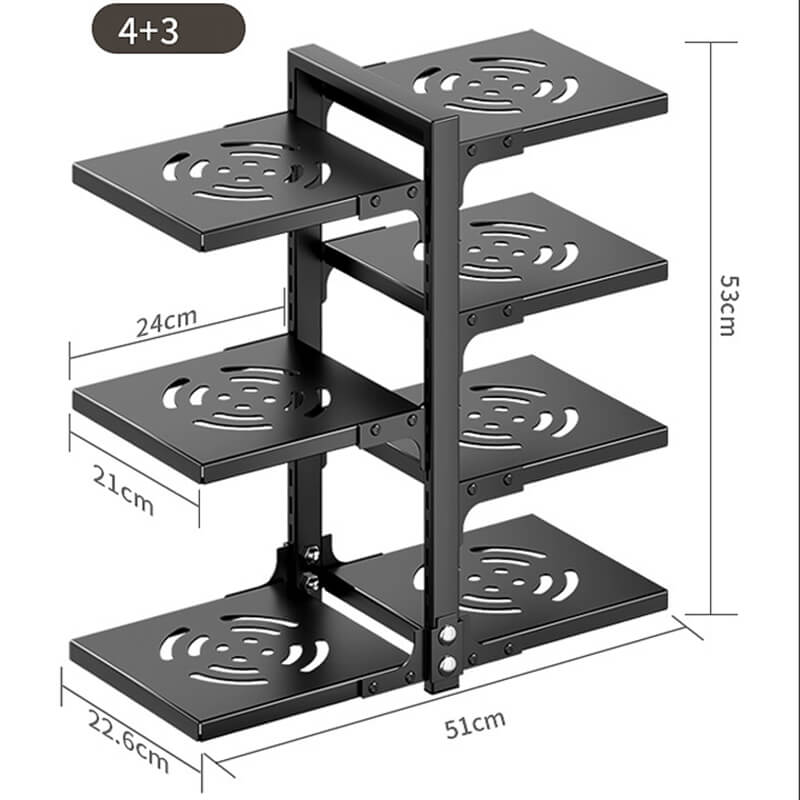4+3 Configuration: 4 main shelves + 3 side hooks (53×51×22.6 cm / 20.9×20×8.9 in).