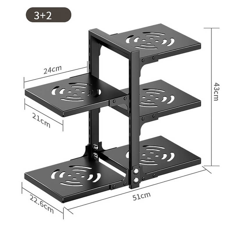 3+2 Configuration: 3 main shelves + 2 side hooks (43×51×22.6 cm / 16.9×20×8.9 in).