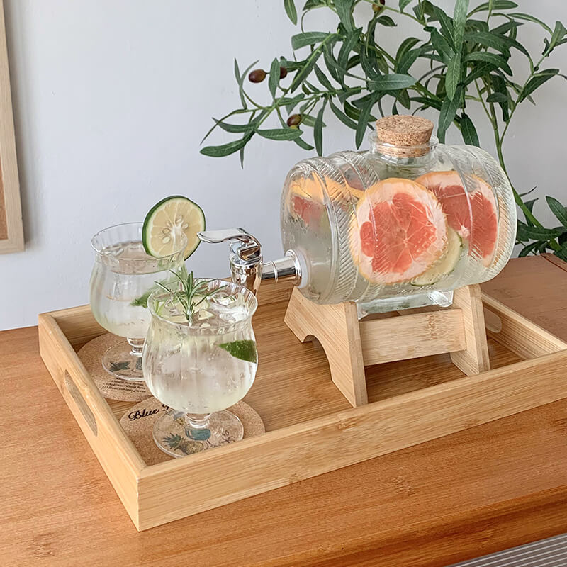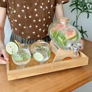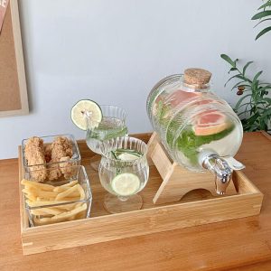 Complete Entertaining Set: Includes 2 beverage glasses (220ml each). 2 snack bowls (250ml each). 1 large glass barrel dispenser (1000ml). and 1 sleek wooden tray for organized serving.