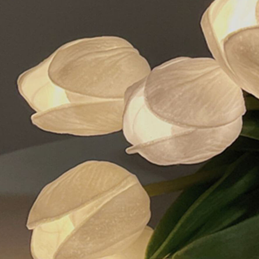 - Graceful Petal Structure: The lamp mimics the delicate curves of tulip petals. with layered petals that fan out from a central base. The PU material boasts a velvety. matte finish. enhancing the lifelike texture and adding a luxurious touch to any room.