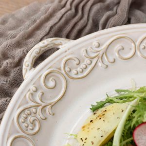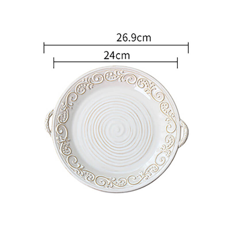 The Lighteme Vintage Embossed Ceramic Dinner Plate (Item No: 202306DP29) seamlessly blends old-world elegance with functional design. offering a sophisticated addition to your tableware collection. Crafted from high-quality ceramic. this plate features a vintage-inspired embossed pattern and two convenient handles. making it both a stylish centerpiece and a practical serving solution for everyday meals and special occasions.