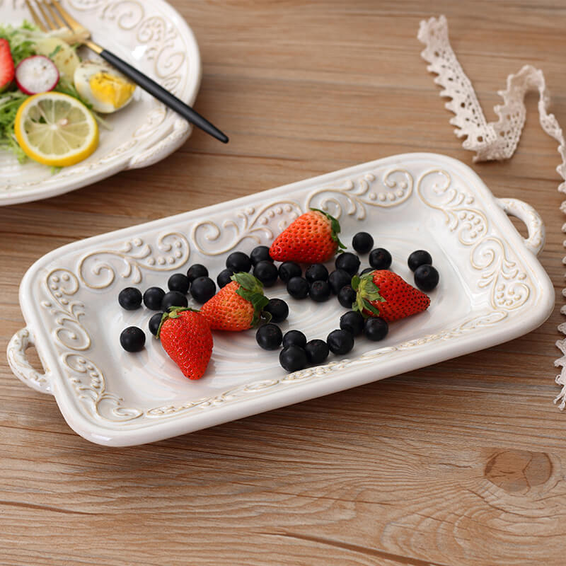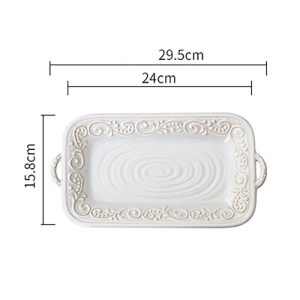 - Versatile Serving: The handles make this plate ideal for serving casseroles. roasted dishes. or even as a stylish platter for charcuterie or desserts. The deep rim prevents spills. while the embossed design elevates the presentation of any dish.