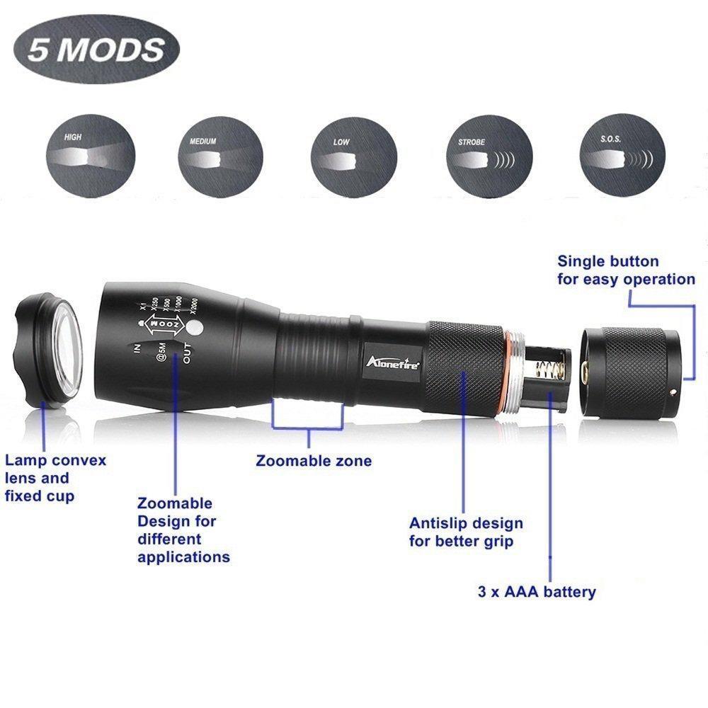 5-MODE FEATURE (High - Medium - Low - Sos - Strobe) offers multi-function options.