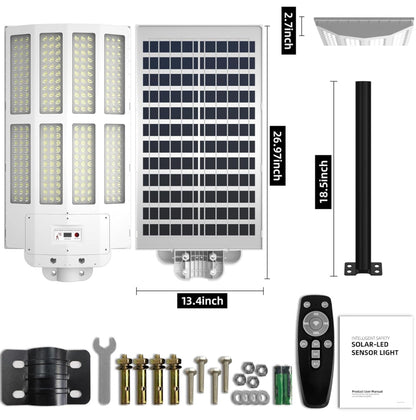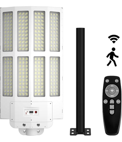 Transform your outdoor spaces with our advanced solar-powered light, designed to deliver unmatched brightness and smart functionality. Featuring 1,120 high-intensity LEDs, this system produces a remarkable 200,000 lumens of daylight-like illumination, ensuring up to 8-10 hours of consistent nighttime coverage.