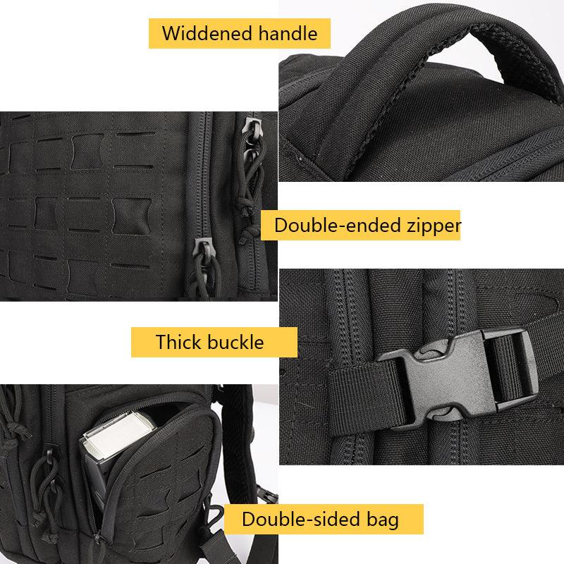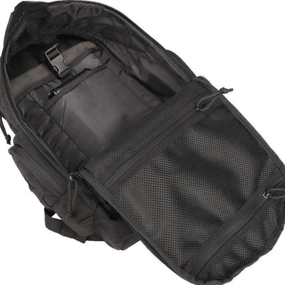 Lighteme 48 Tactical Mountaineering Backpack is designed to hold enough gear for a 48 hours mission. Made from rugged, water-resistant nylon, this pack keeps your gear secure and dry. The shoulder, sternum, and waist straps adjust to provide a custom fit. The yoke system in the shoulder straps distributes weight evenly and thick padding increases comfort. Four pads on the back ventilate and support, while tacky rubber prevents the pack from jostling around when you're on the move. The spacious main storage compartments provide ample storage for big items, while smaller zippered pockets, key chain fobs and pockets with retention straps organize smaller gear.
