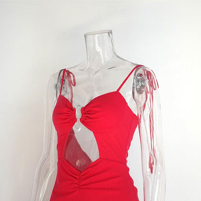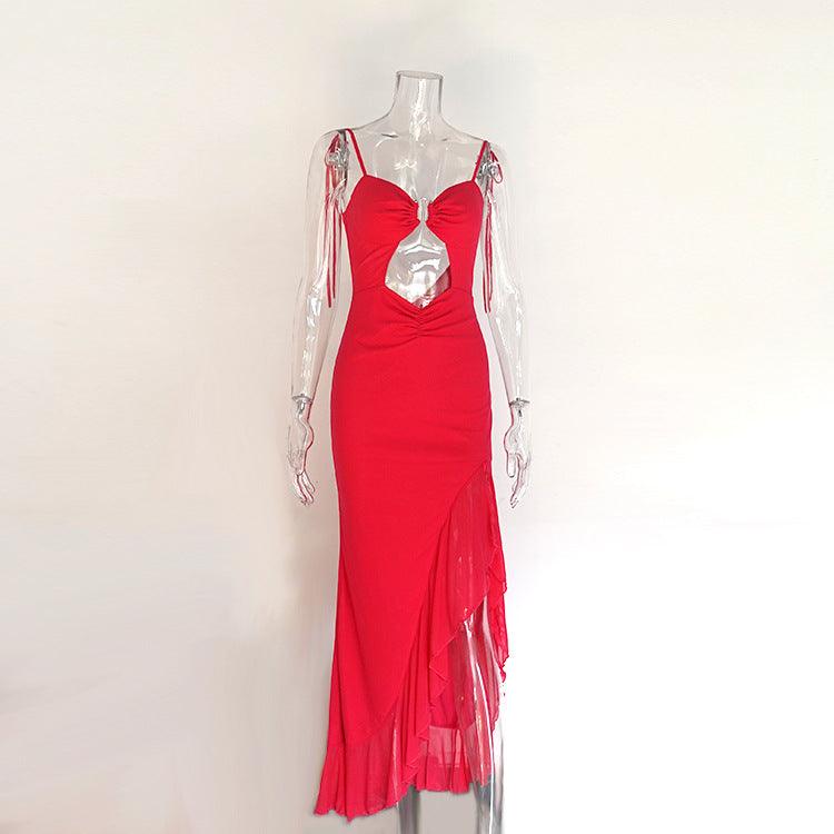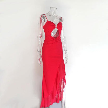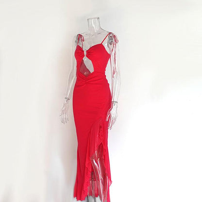 The ruffled split adds a playful touch, while the solid color ensures timeless elegance. Ideal for everything from glamorous nights out to intimate dinners, this dress is your go-to for feeling fabulous.