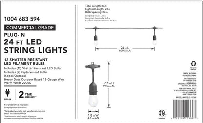 - Configuration: 12 warm-white LEDs (2700K) across 24' weatherproof strand