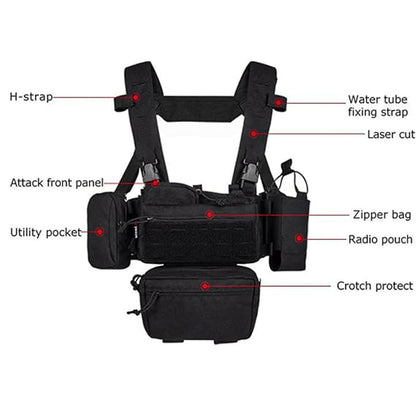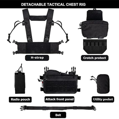 The Modular Rapid Assault Tactical Chest Rig is completely versatile to cater to your mission. It is made of 1000D Nylon for superior resistance to abrasion and tearing, with water-repellent properties. It's easy to wear and take off, with detachable, configurable pouches and accessories that can be arranged to your own needs. Make it yours for wilderness adventures and survival prepping for airsoft tourneys.