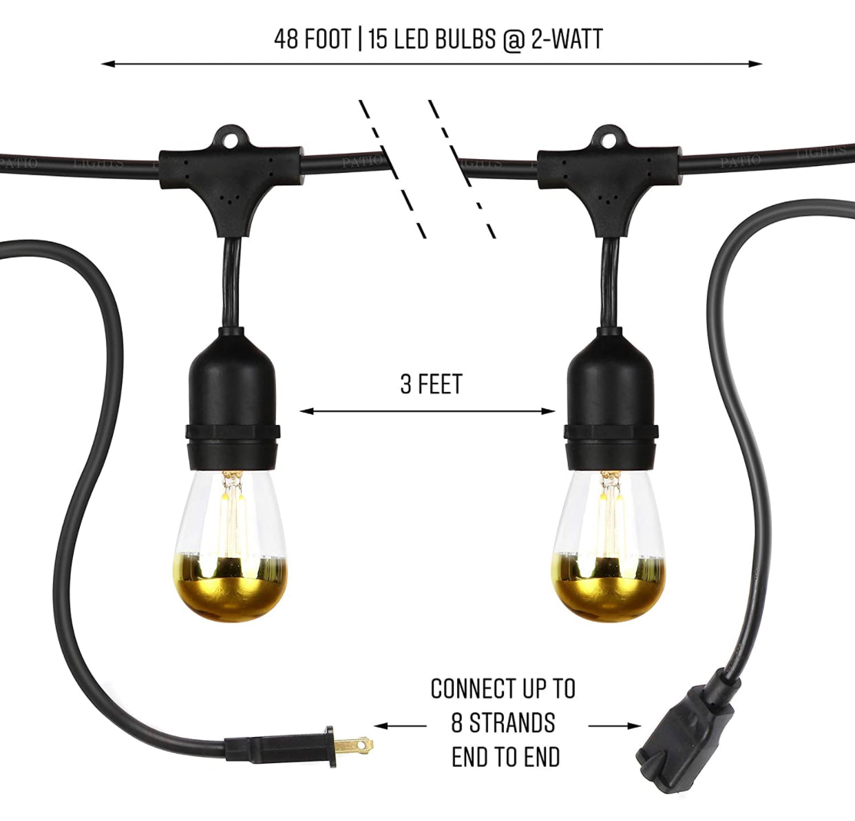 Strand Length: 48ft illuminated span (15x 3W Edison bulbs)