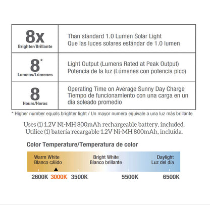 - 8-Hour Runtime: Provides up to 8 hours of continuous nighttime light after a full solar charge (weather-dependent), ensuring consistent performance for evening gatherings or daily use.
