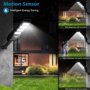 - Motion – Sensing Function: Employing Smart Motion brightness control. the lights shine at 100% brightness upon detecting motion. Twenty seconds after the motion stops. the brightness reduces to 30%. The solar street lights have a working lifespan of over 50.000+ hours.