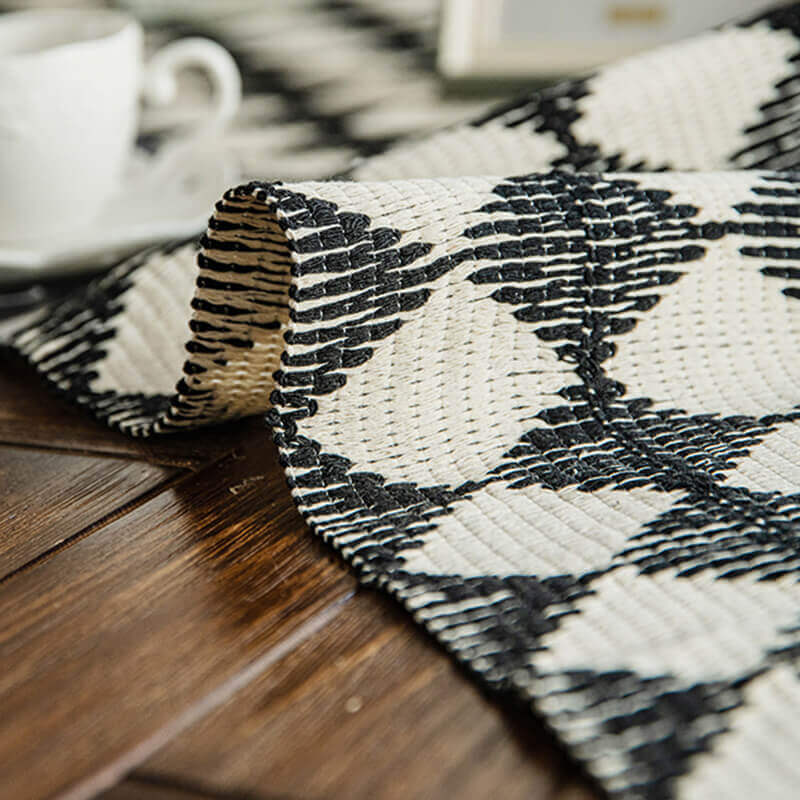 - Versatility: This table runner serves as a decorative piece that complements a wide range of decor themes. The black and white color scheme makes it suitable for both formal and casual dining occasions. It can be used for everyday meals, family gatherings, or special events. The simplicity of the color scheme allows it to blend seamlessly with other elements on the table, such as plates, cutlery, and centerpieces, while still making a statement with its natural jute texture.