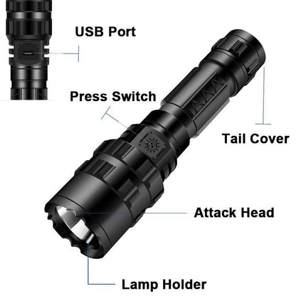 ULTRA BRIGHT MILITARY-LED FLASHLIGHT 4800 lumens, powerful enough to light up an entire room or zoom in on distant objects with 500m beam.